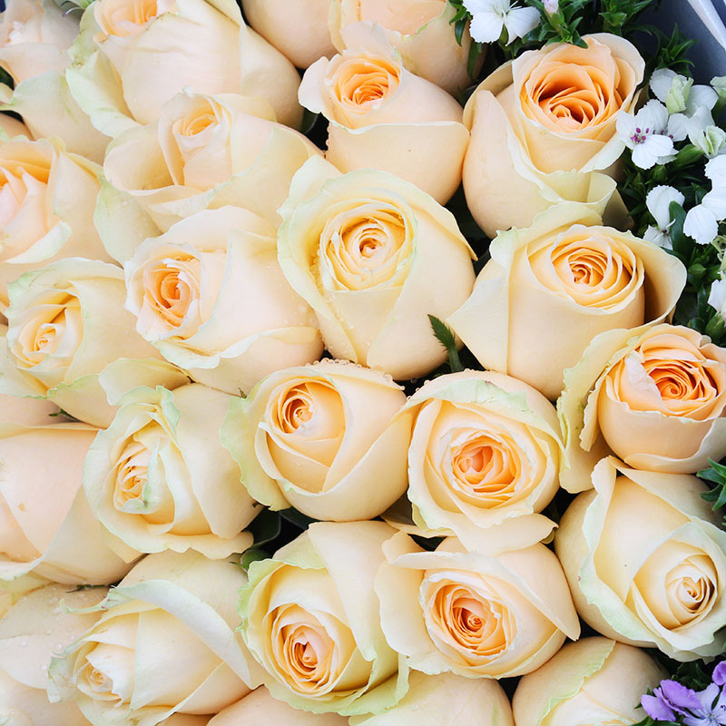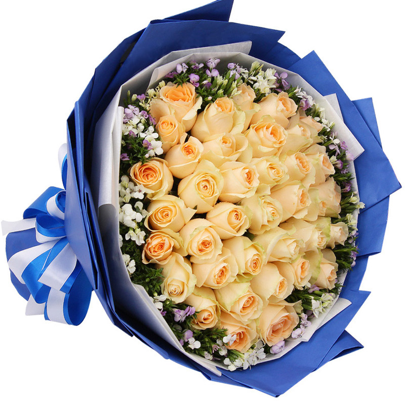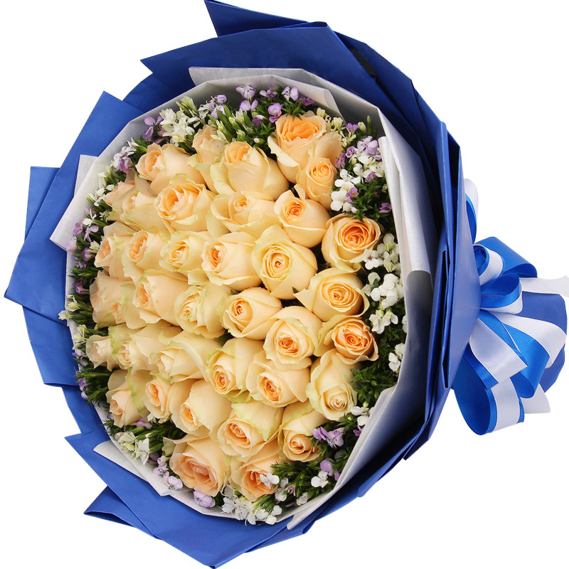 花材: 33朵精品香槟玫瑰,搭配相思梅外围丰满点缀。