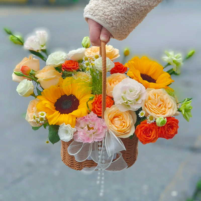 花 材: 精选8枝香槟玫瑰,2枝向日葵,1朵粉色康乃馨,3支多头橙色泡泡,4支浅色多头洋桔梗,搭配洋甘菊、喷泉草、尤加利叶装饰。