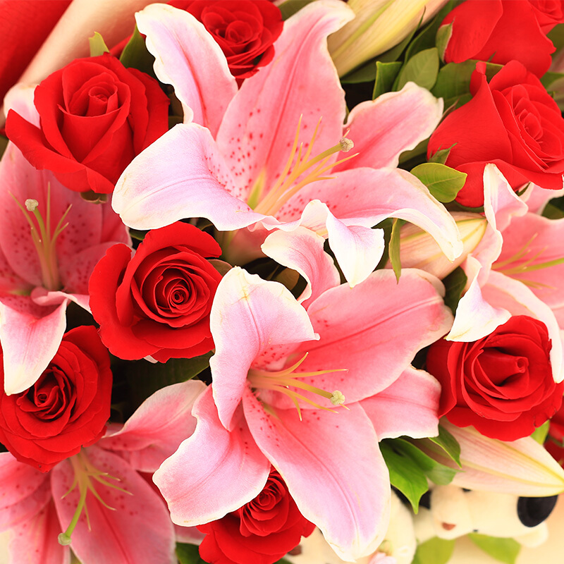 花 材:12朵红玫瑰,2只可爱小熊,3支多头粉百合,搭配适量栀子叶间插。