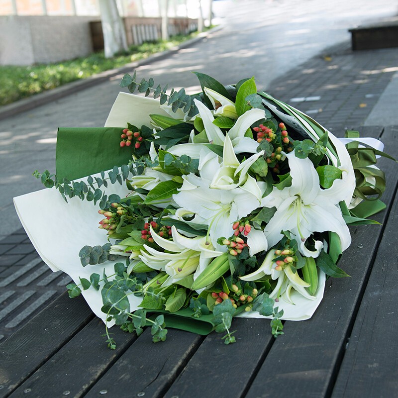 花材: 精选6支多头百合,红豆、尤加利叶、绿叶丰满间插。