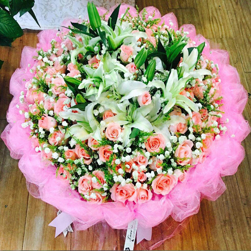 花 材:99朵精品粉玫瑰,21朵百合,满天星、黄莺搭配。