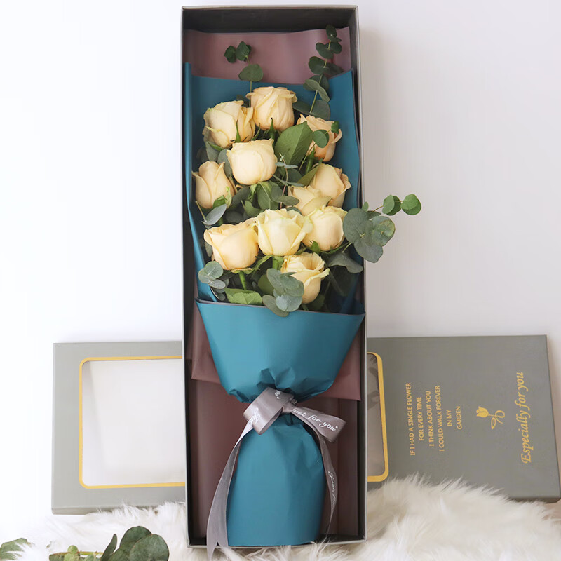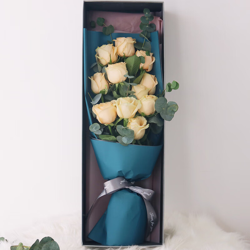 花材: 11朵香槟玫瑰,搭配尤加利叶装饰。