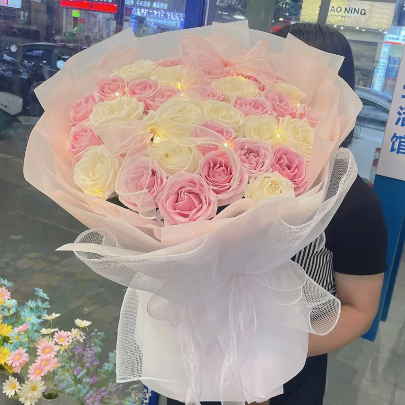 花材: 白玫瑰、粉玫瑰共33朵混搭,1条灯串,搭配2个缎带蝴蝶结装饰花面。