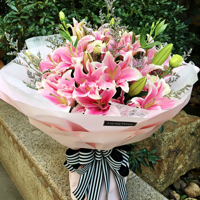 花材: 27朵粉色香水百合,情人草,绿叶间插。