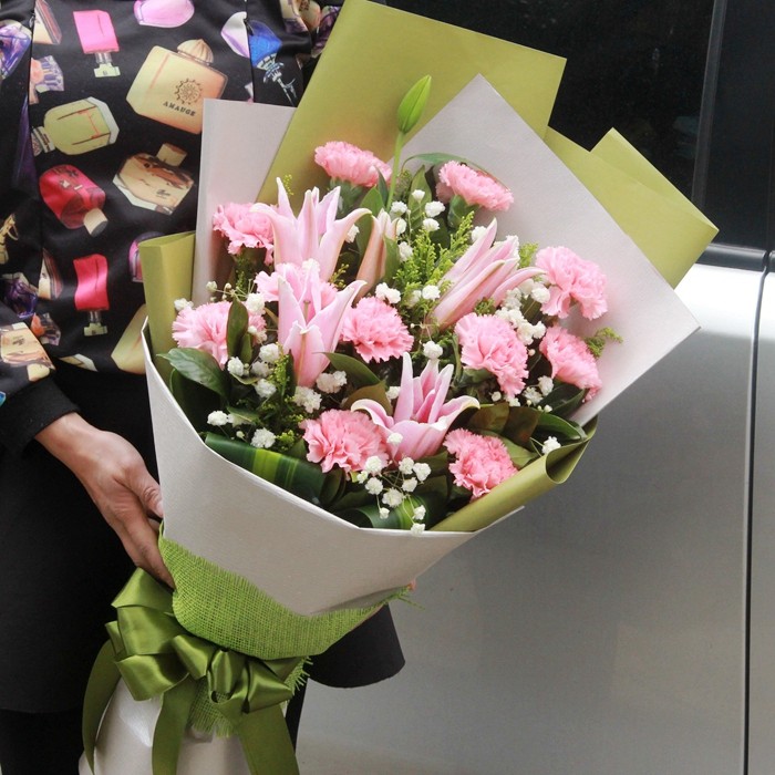花材: 11支粉色康乃馨,6朵粉色百合,满天星、巴西叶装饰。