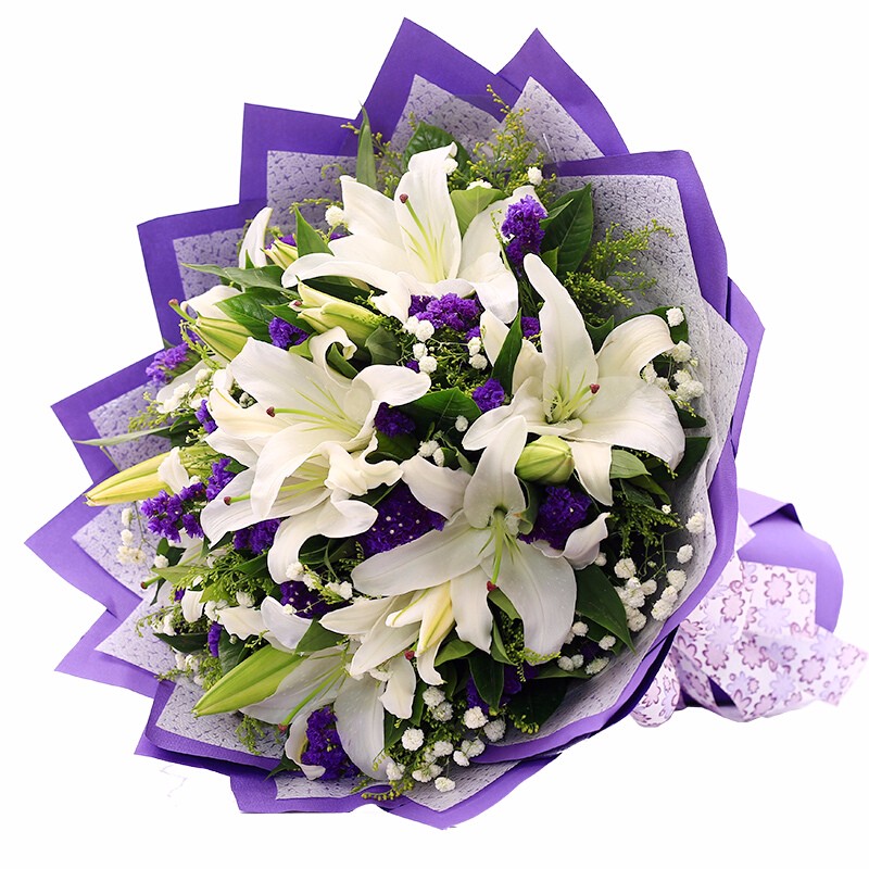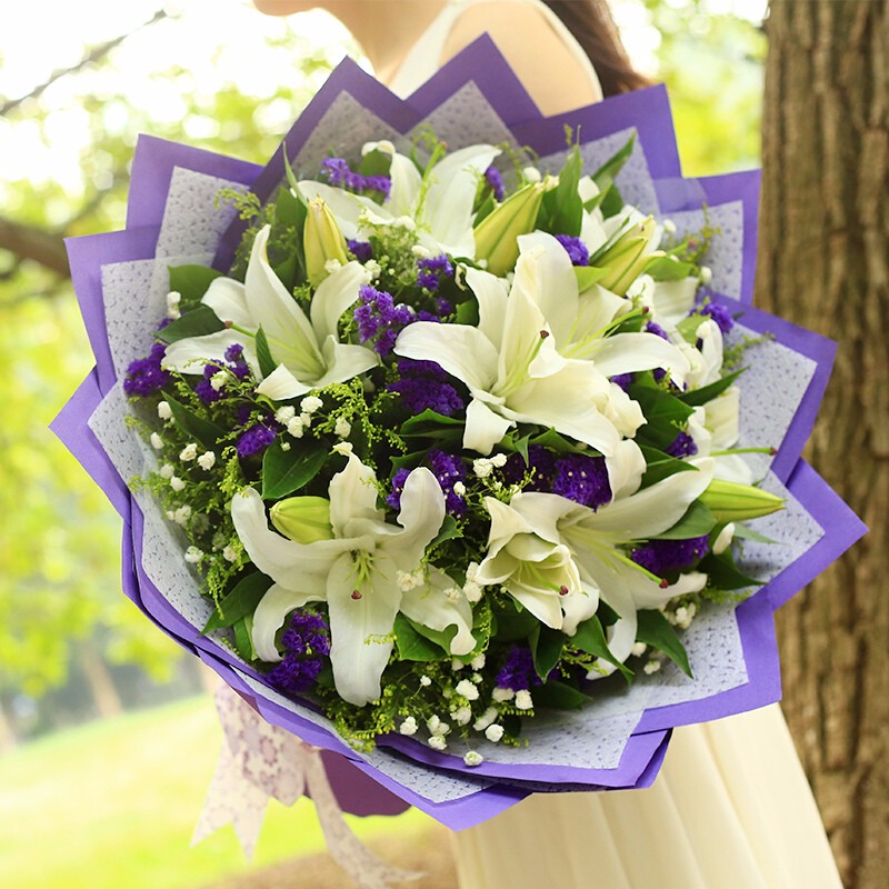 花材: 精选15朵白色香水百合,搭配勿忘我、满天星丰满间插。