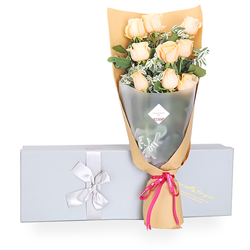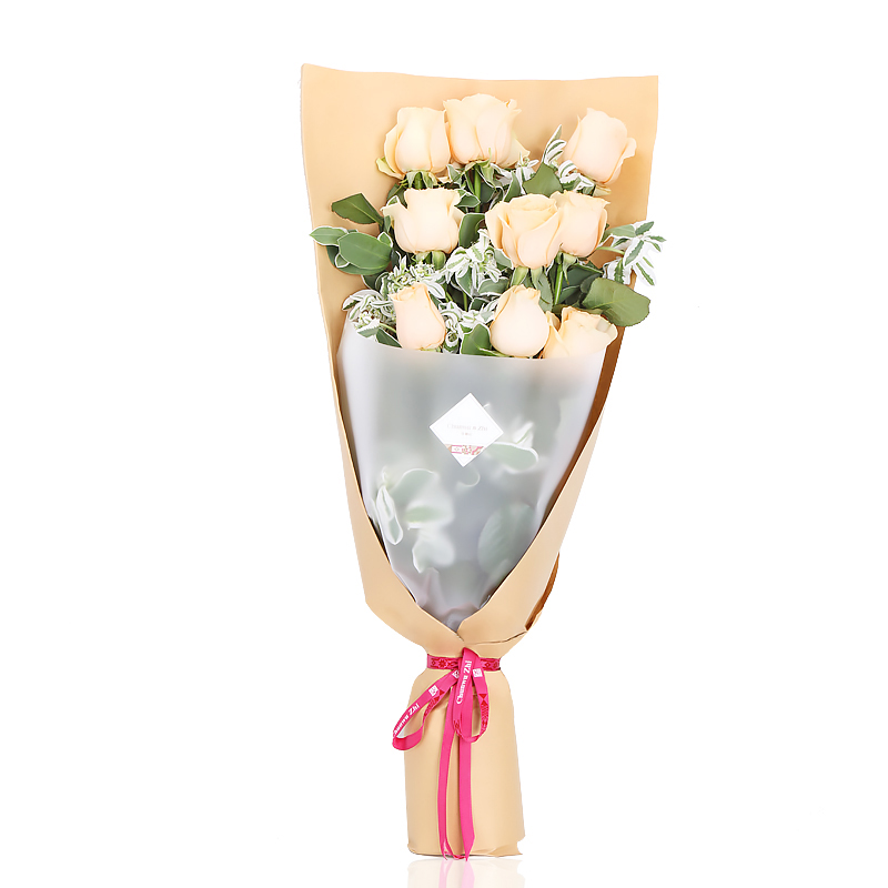 花 材:9支精品香槟玫瑰,搭配适量银边翠间插。