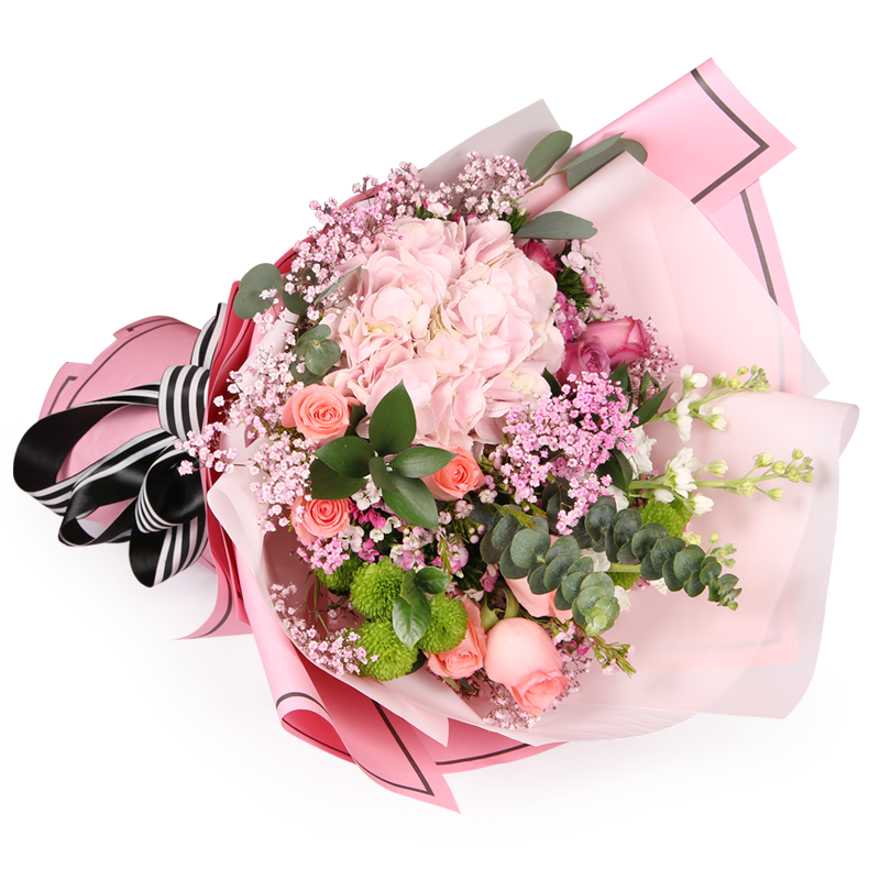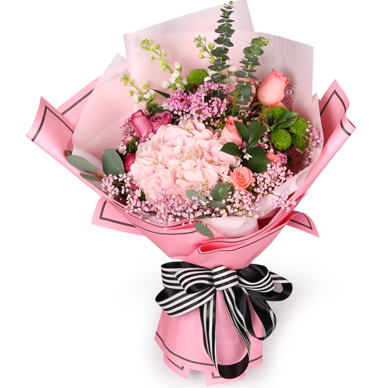 花 材:精选1枝粉色绣球,9枝粉玫瑰,搭配尤加利叶,粉色满天星,绿色小雏菊,绿叶等装饰。