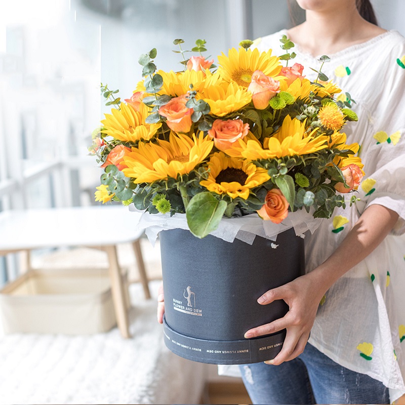 花材: 12朵向日葵,11朵金辉玫瑰(或香槟玫瑰),小雏菊,尤加利叶等搭配