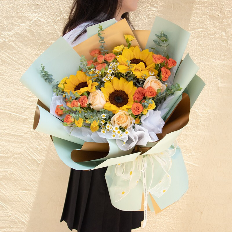 花材: 3朵向日葵,3朵香槟玫瑰,6支多头橙色、黄色混搭小玫瑰,尤加利叶装饰。