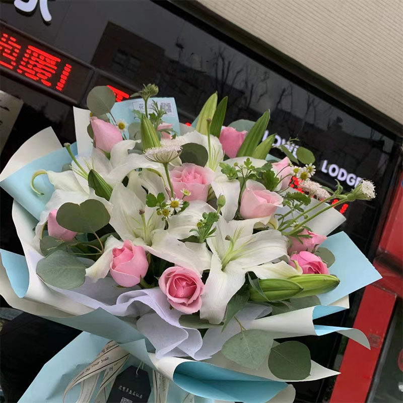花 材:11朵粉玫瑰,3支多头白色香水百合,搭配洋甘菊、尤加利叶间插。