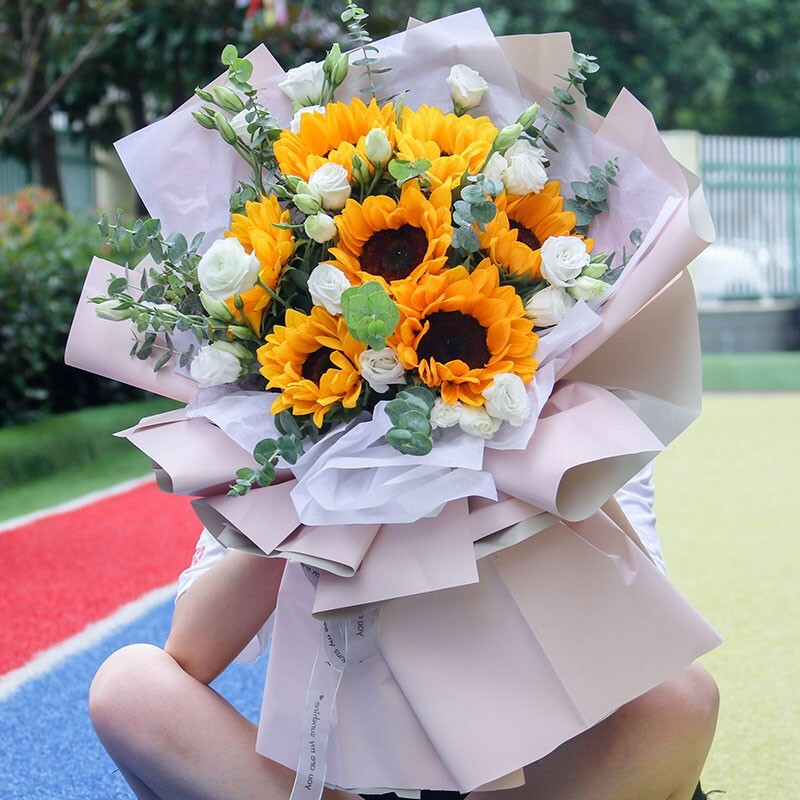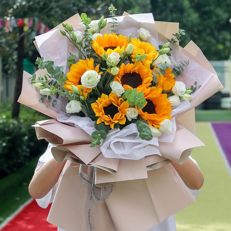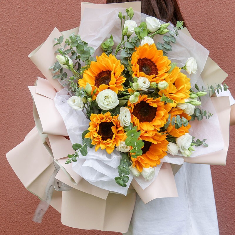 花 材:精选7朵向日葵,搭配桔梗,尤加利叶装饰。