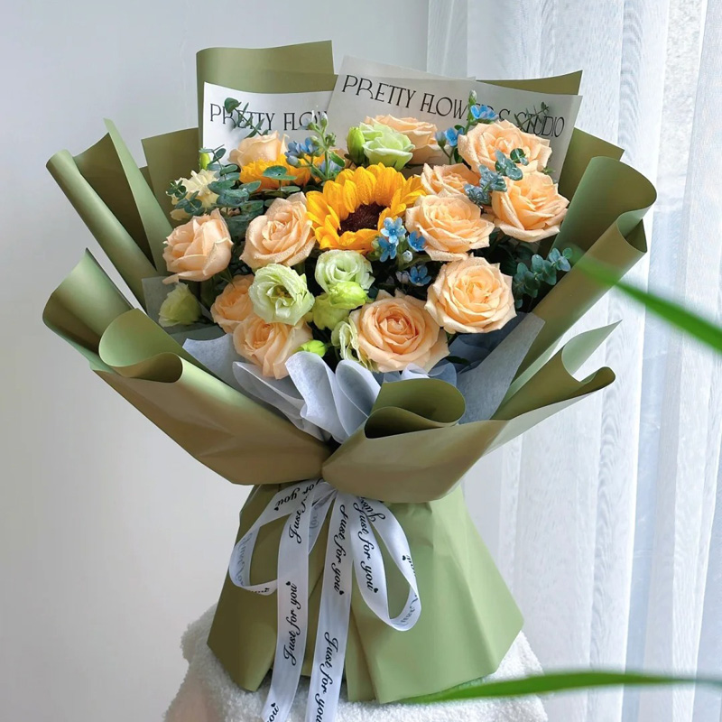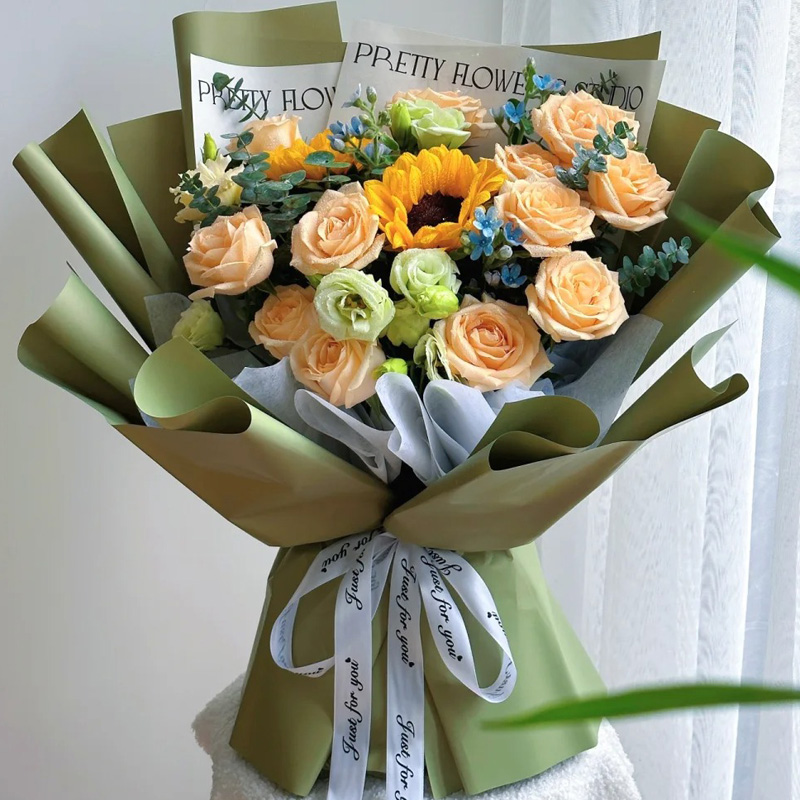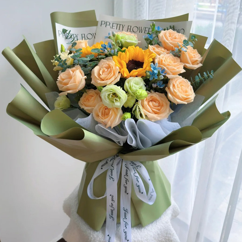 花 材:2支向日葵,11朵香槟玫瑰,搭配4支洋桔梗,尤加利叶装饰。