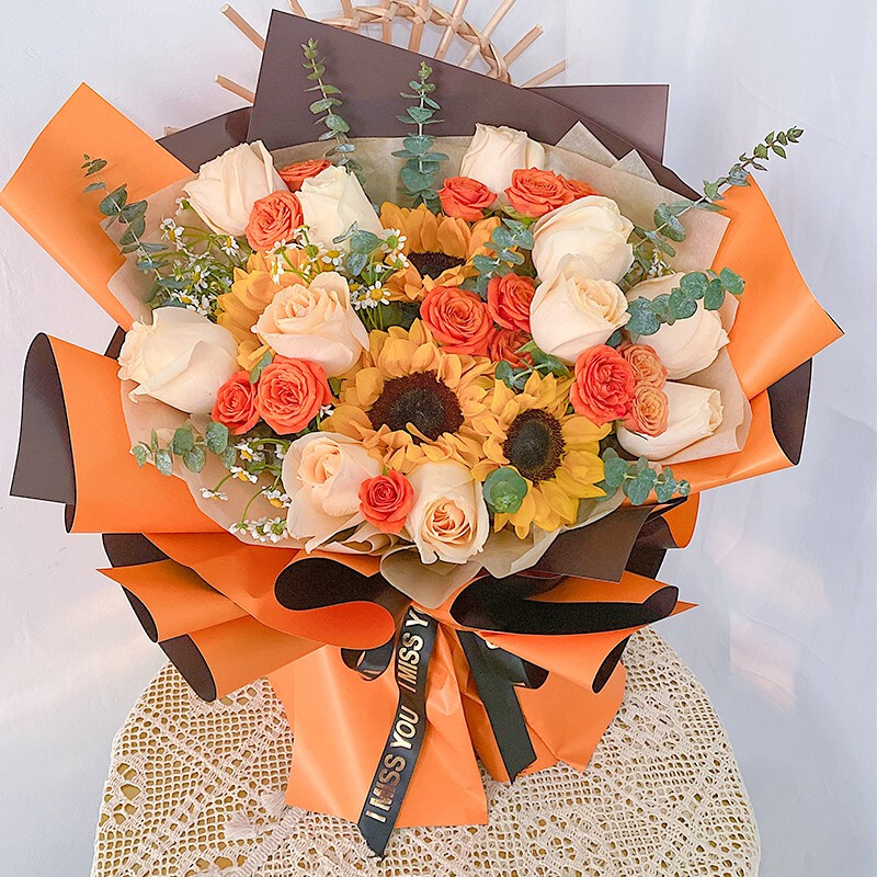 花材: 4支向日葵,11朵香槟玫瑰,5支多头橙色小玫瑰,搭配尤加利叶装饰。