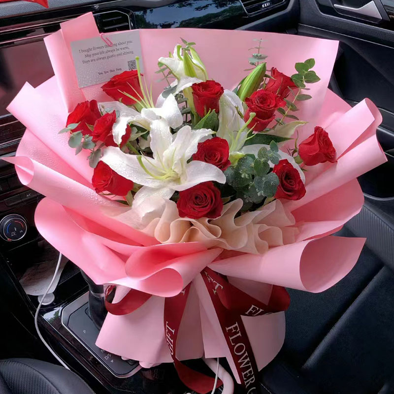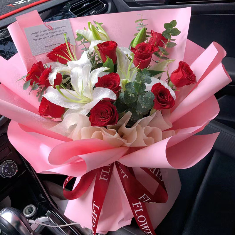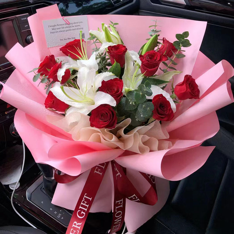 花 材:11朵红玫瑰,2支多头白色香水百合,搭配尤加利叶装饰。