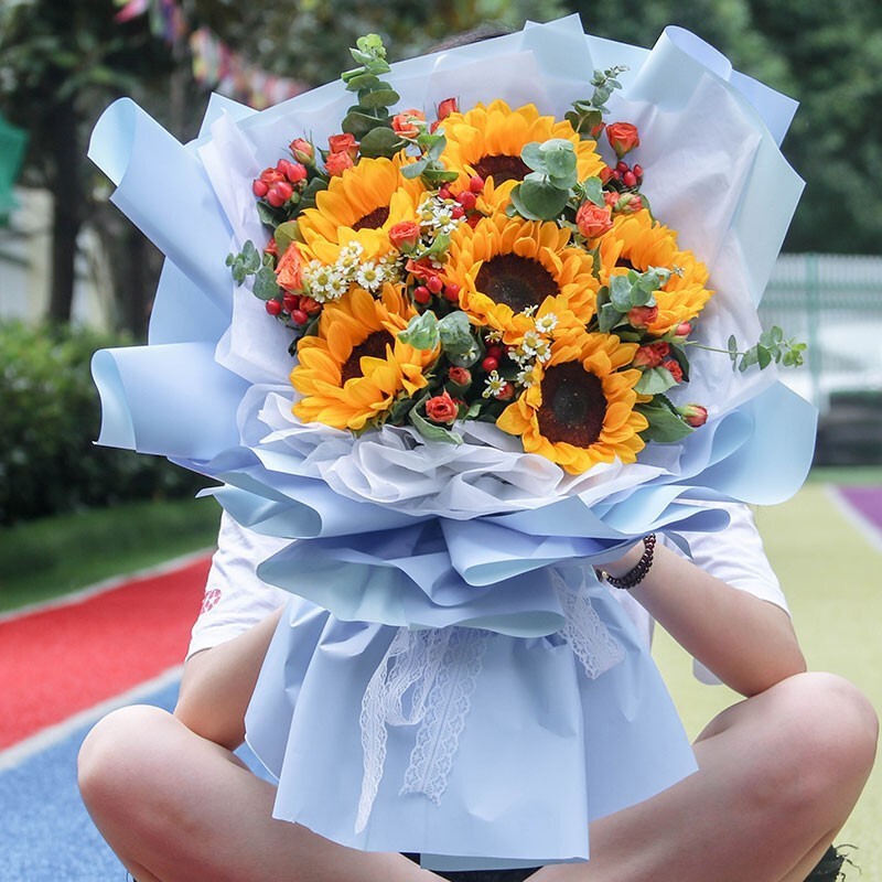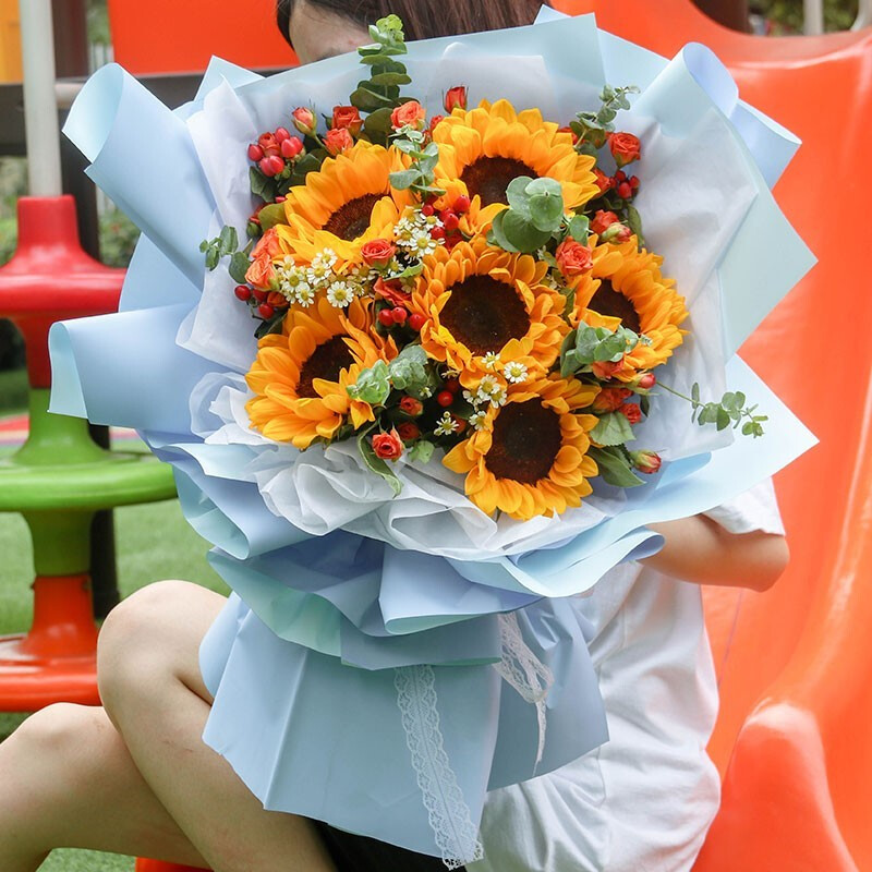 花材: 6枝向日葵,搭配红豆、尤加利叶,洋甘菊,多头橙色小玫瑰装饰。