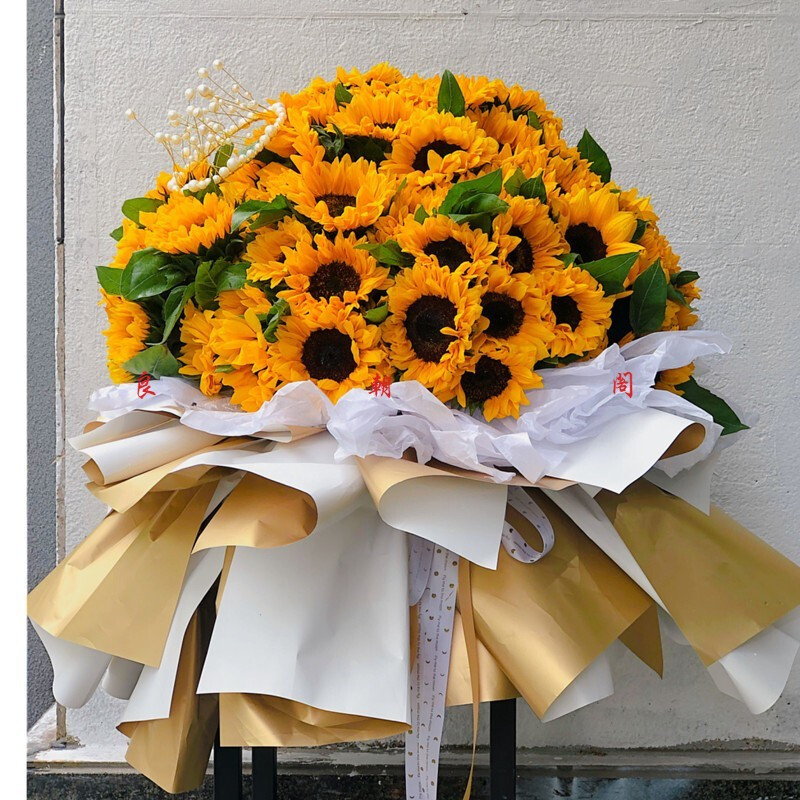 花 材:精选52枝向日葵,白色雪梨纸金色/白色双色纸外包,同色系花结。