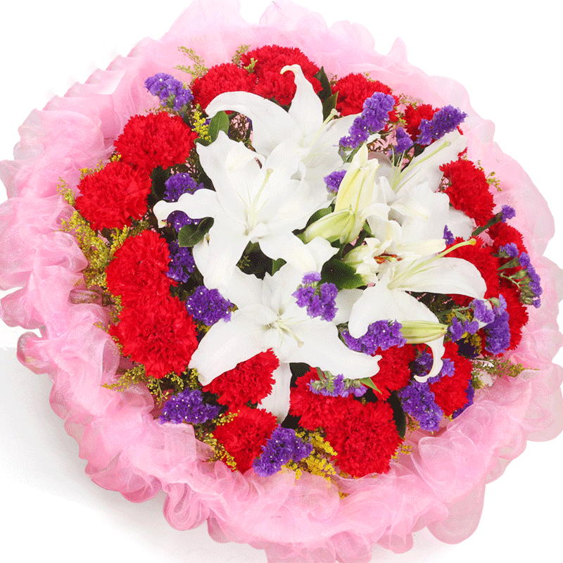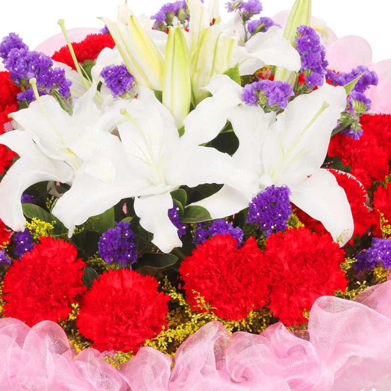 花 材:19支红色康乃馨,3支多头香水百合,搭配黄莺、勿忘我装饰。