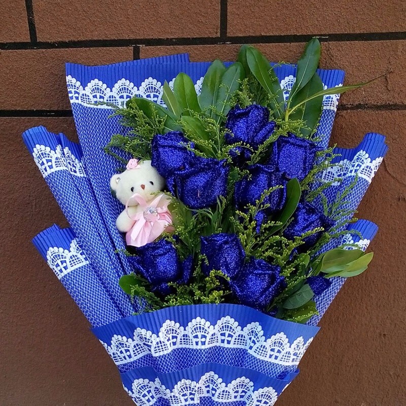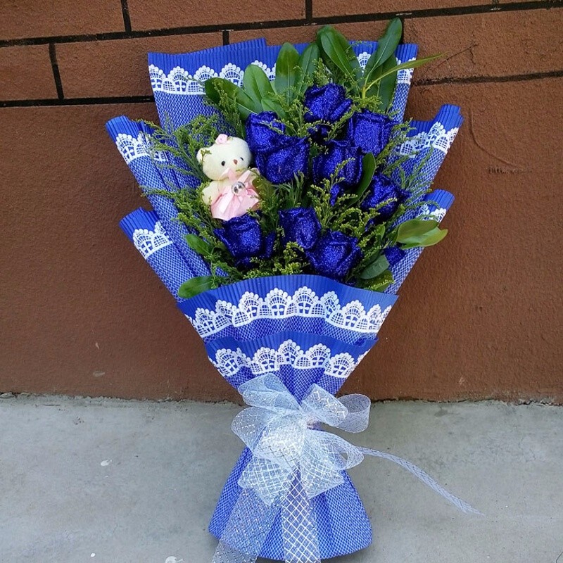 花 材:9支蓝玫瑰,1只小熊公仔,搭配黄莺、绿叶装饰。