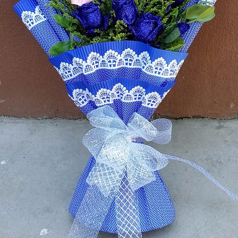 包装: 蓝色印花纸包成扇形花束,白色丝带。