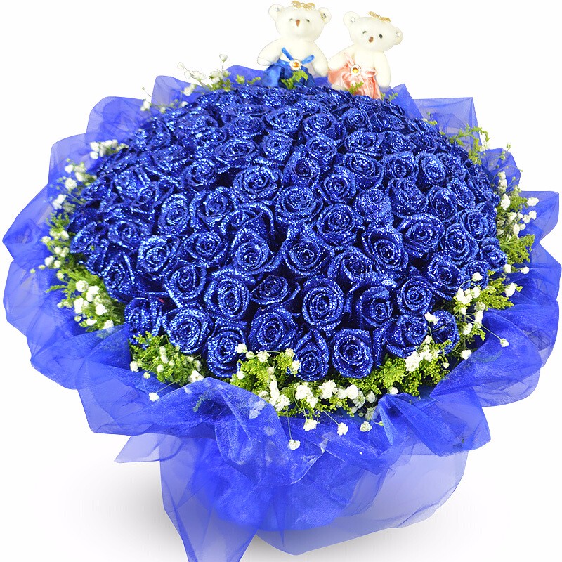 花材: 66朵顶级蓝玫瑰,2只可爱小熊,满天星、黄莺环绕。