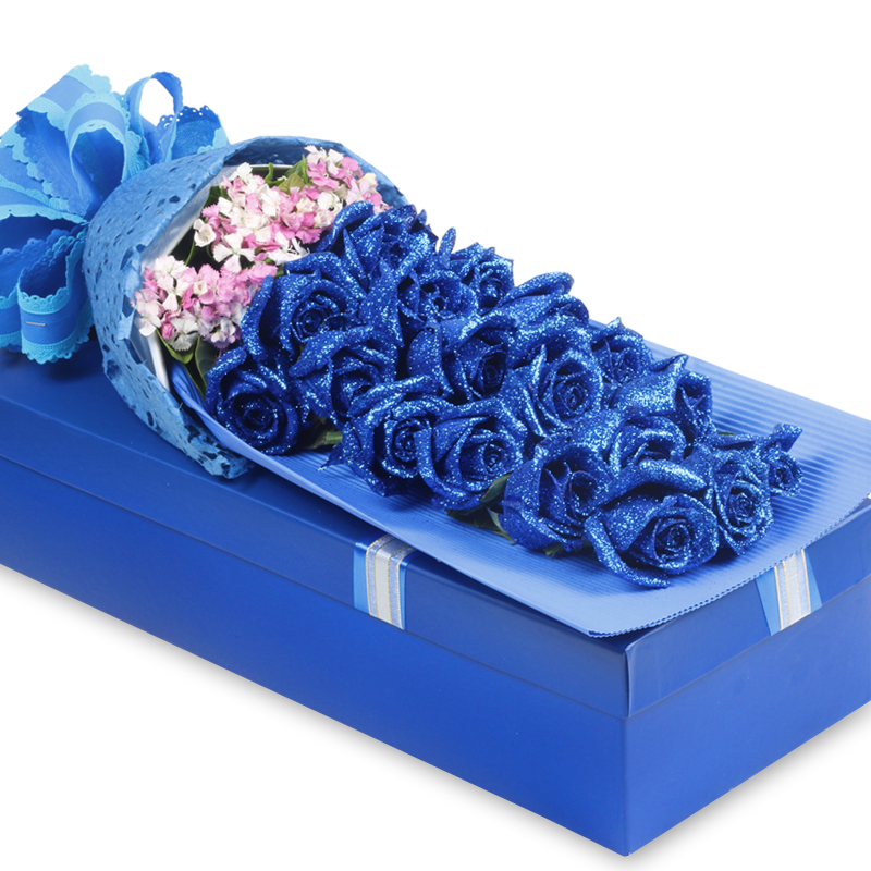 花材: 19朵精品蓝色妖姬,搭配石竹梅装饰。