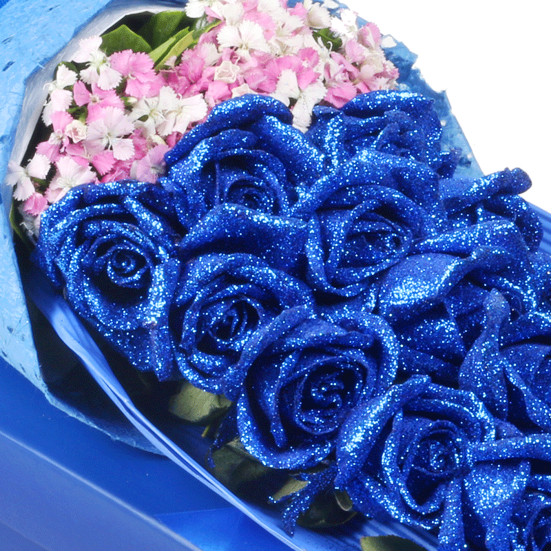 花 材:19朵精品蓝色妖姬,搭配石竹梅装饰。