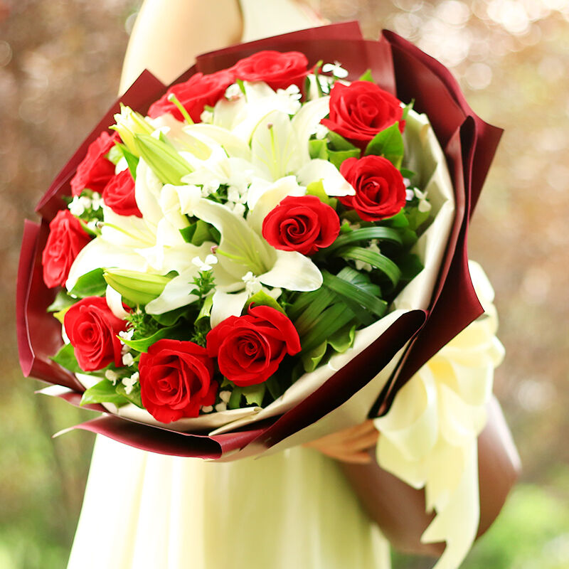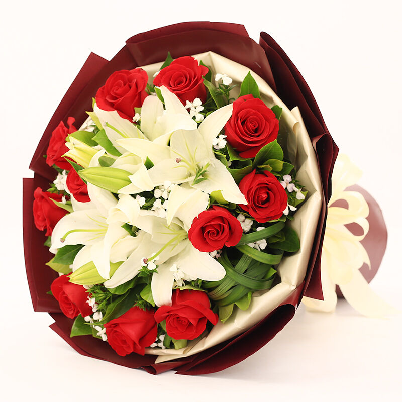 花材: 11支红玫瑰,6朵白色香水百合,搭配相思梅、绿叶等装饰。