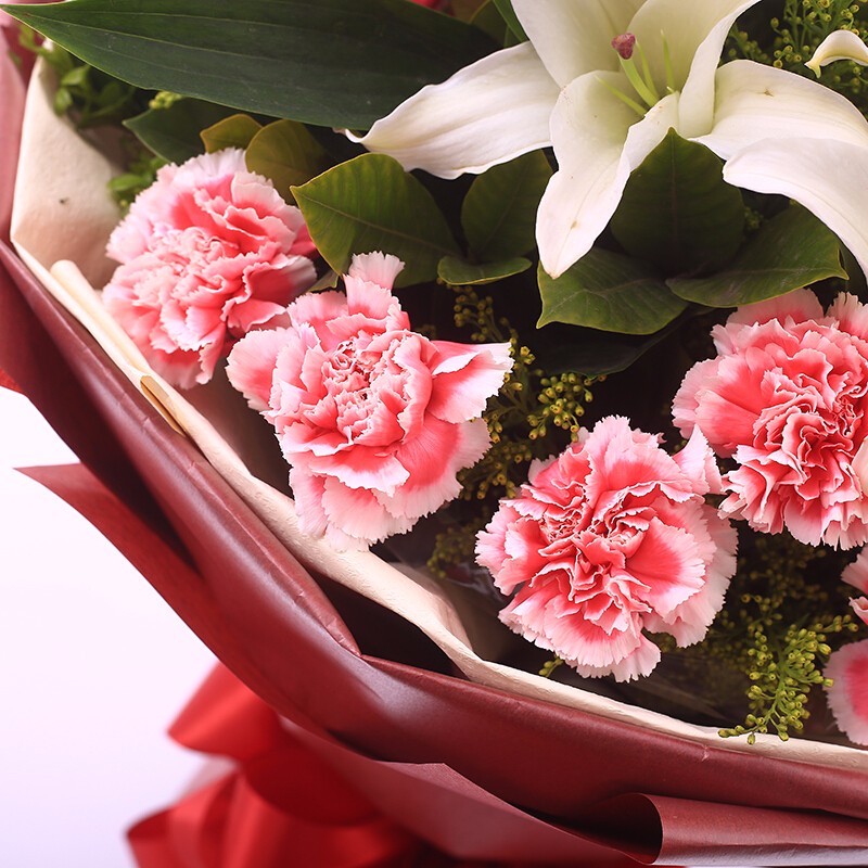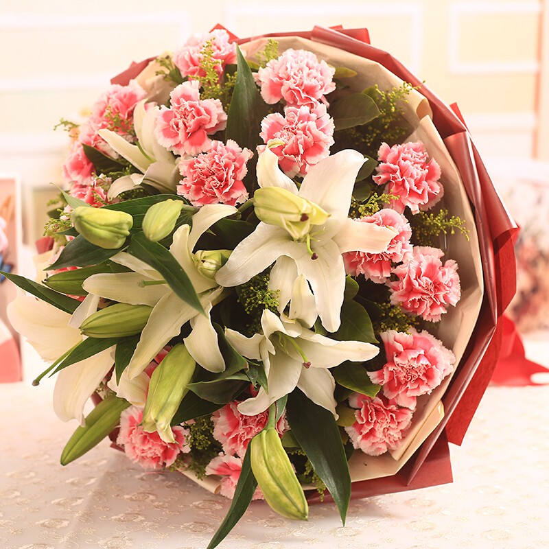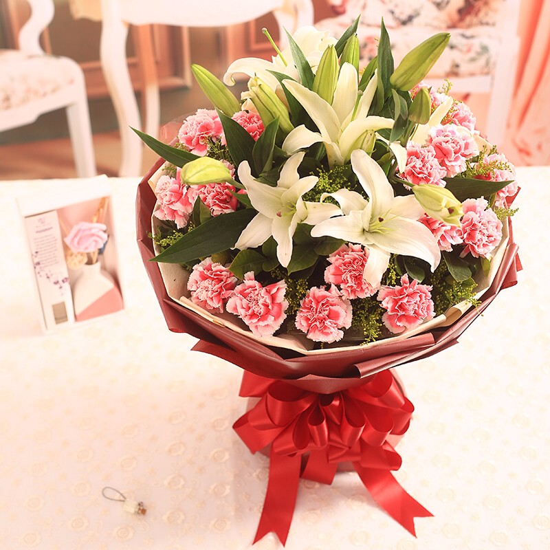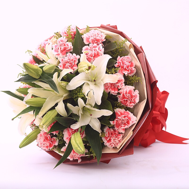 花 材:19支粉色康乃馨,4支多头白色香水百合,绿叶、黄莺点缀。