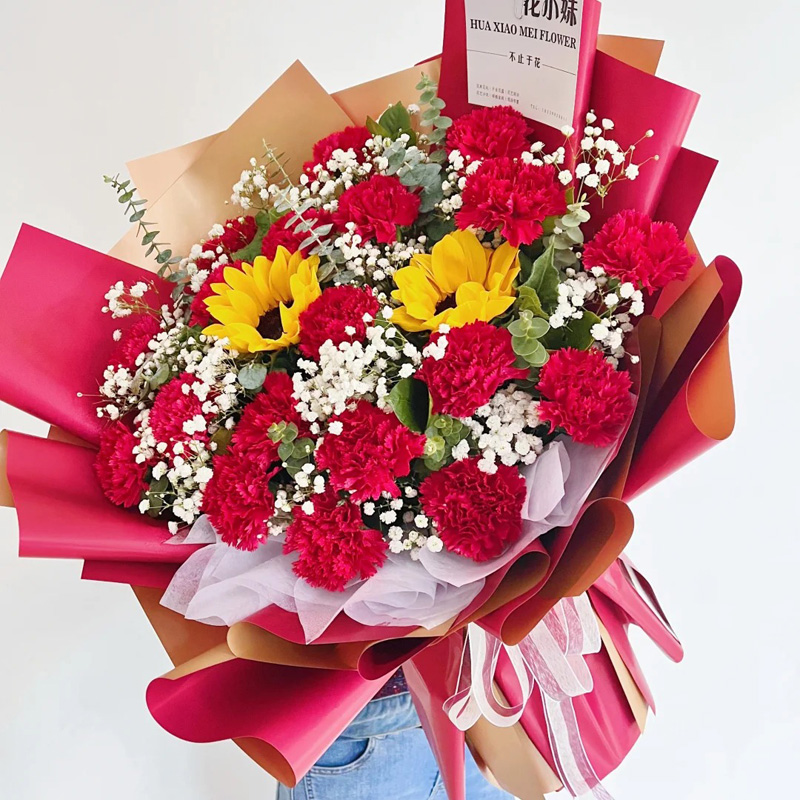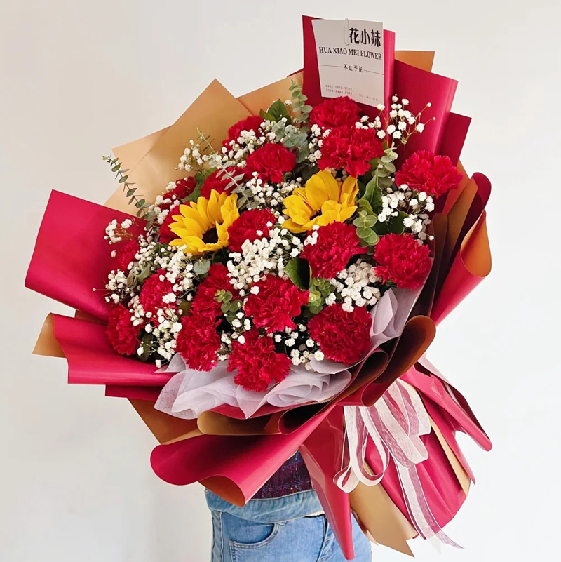 花材: 19支红色康乃馨,2支向日葵,搭配尤加利叶、满天星、栀子叶装饰。