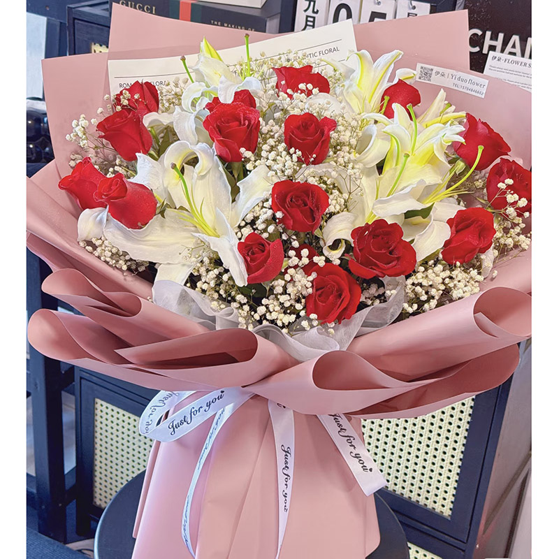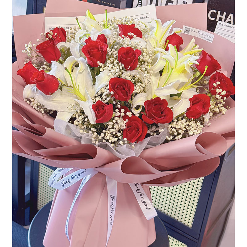花材: 19朵精品红玫瑰,4支多头白色香水百合,搭配满天星装饰。