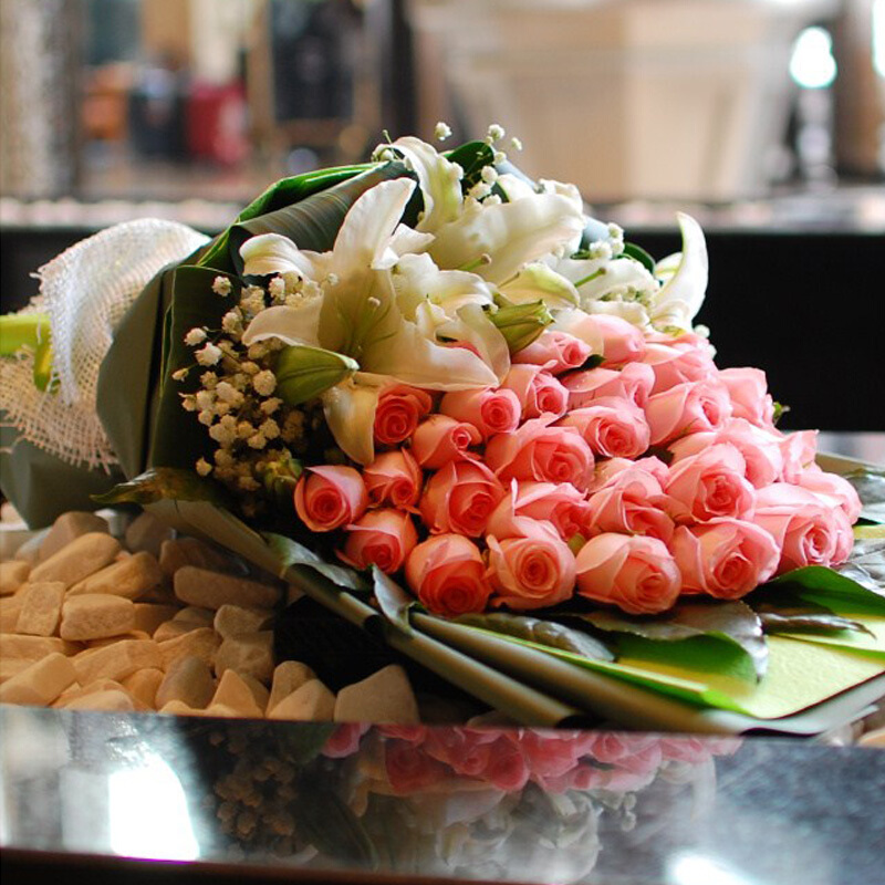 花 材:33支精品粉玫瑰,5朵白色香水百合,搭配黄莺、巴西叶装饰。