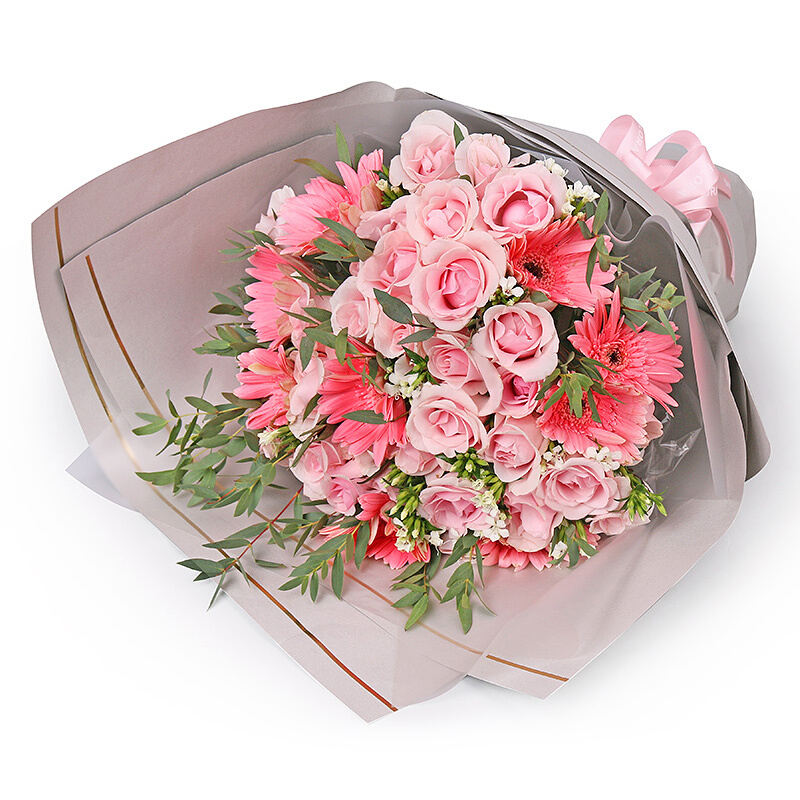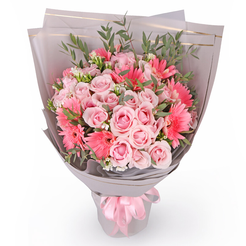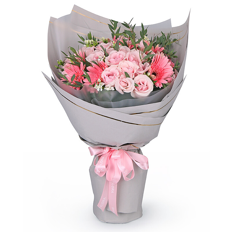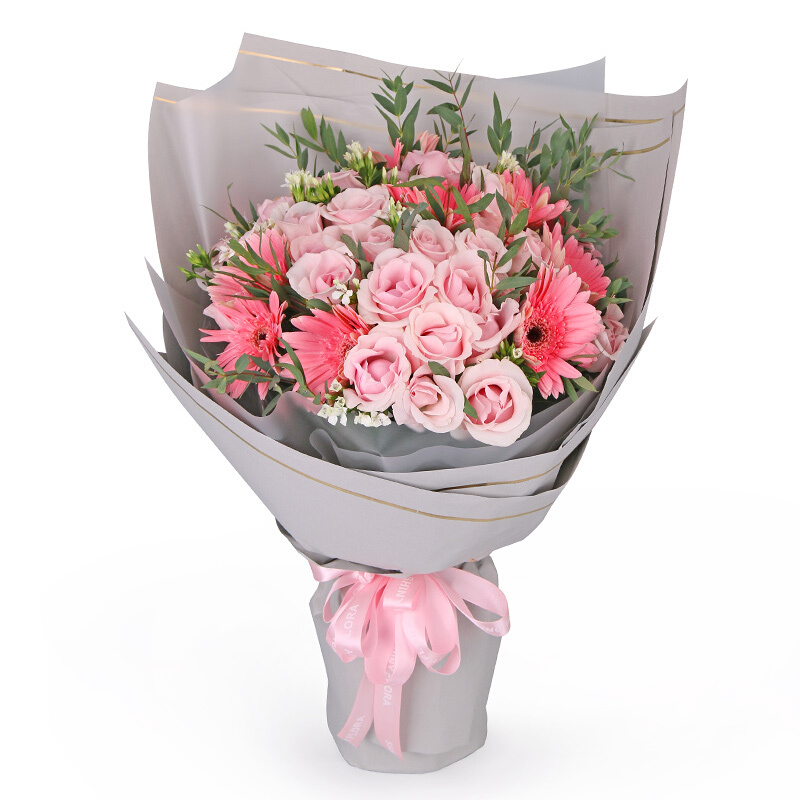 包 装:浅灰色硬面纸多层扇形包扎,粉色丝带花结。