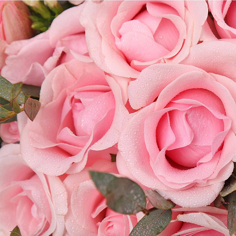 花 材:33朵精品粉玫瑰,9朵粉色太阳花,搭配尤加利尖叶装饰。