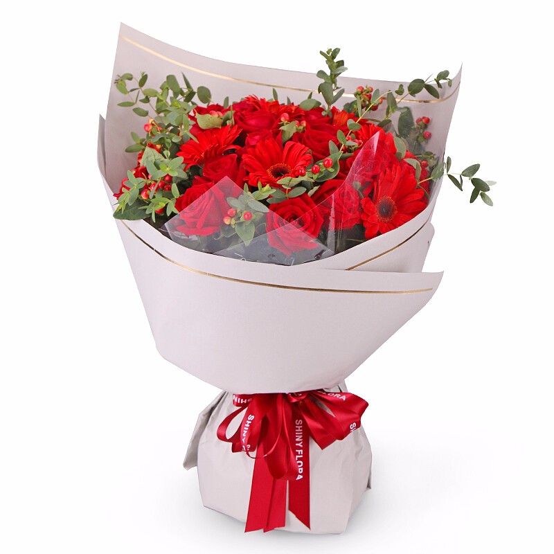 包装: 浅色包装纸扇形包扎,红色精美花结。