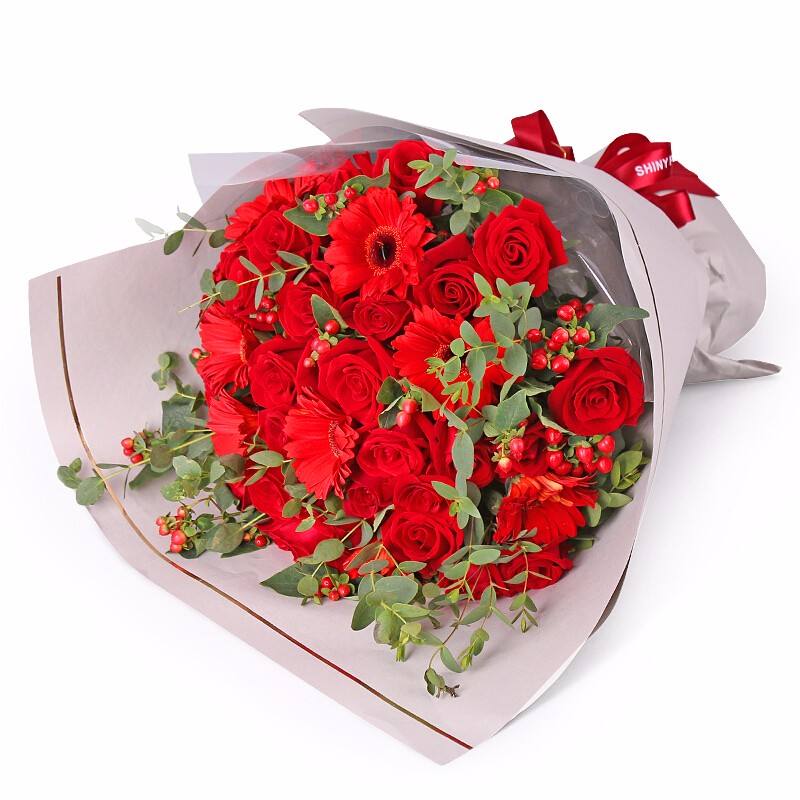 花 材:精选33朵红玫瑰,6支红色太阳花,火龙珠、尤加利尖叶装饰。