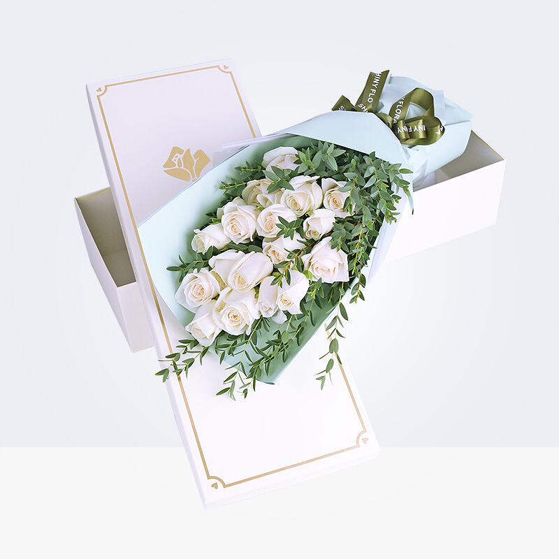 花材: 19朵顶级白玫瑰,尤加利尖叶装饰。