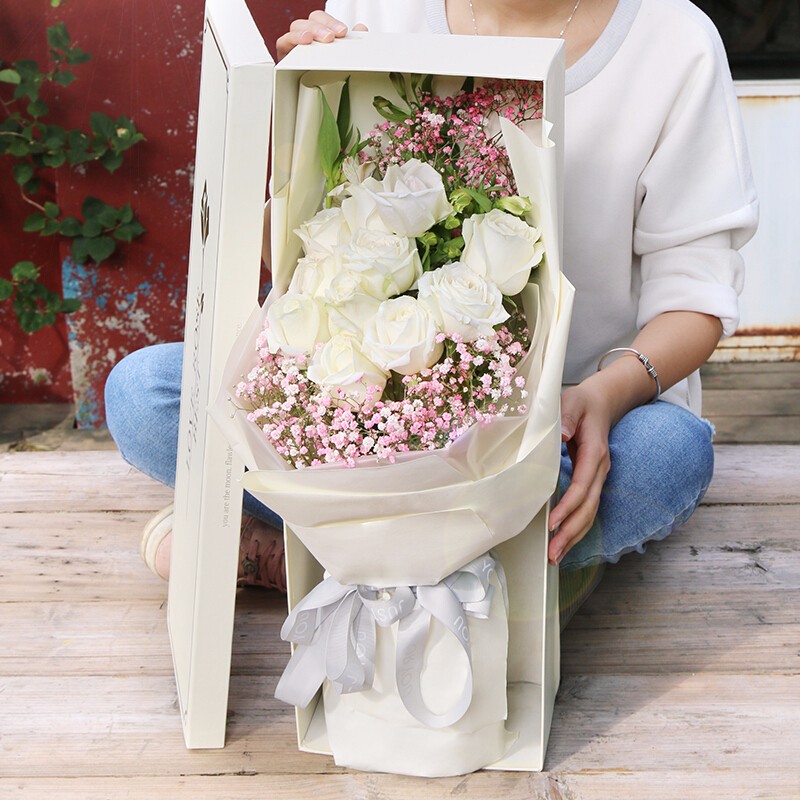 花 材:19朵顶级白玫瑰,搭配进口粉色满天星,绿叶装饰。