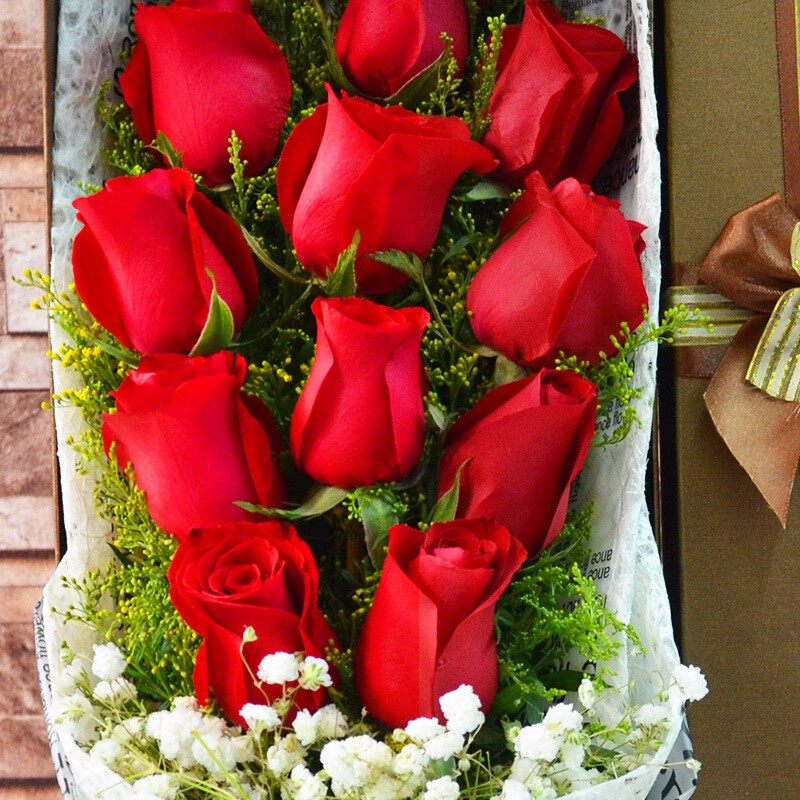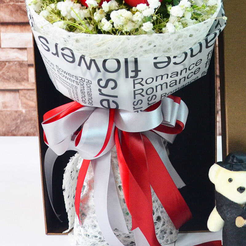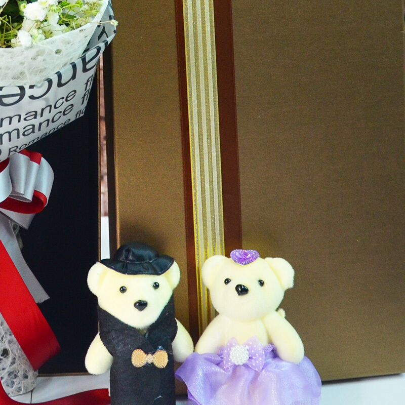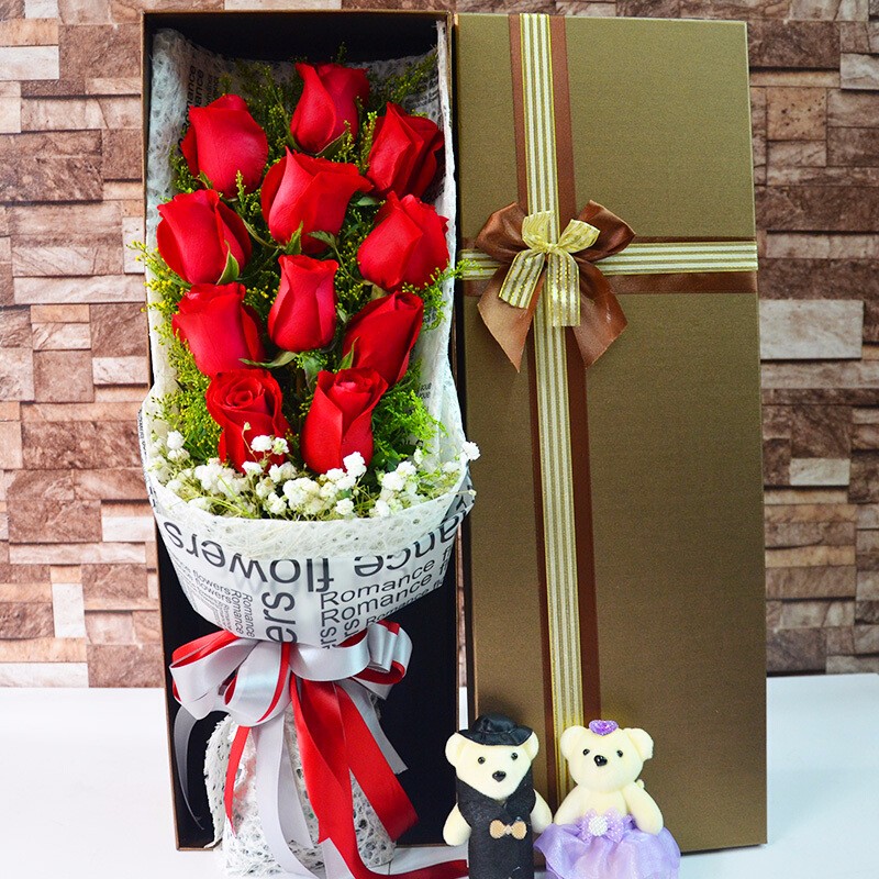 花 材:精选11朵红玫瑰,2只可爱公仔,满天星、黄莺装饰。