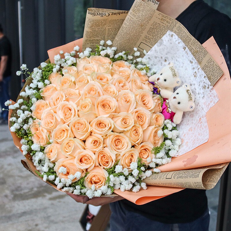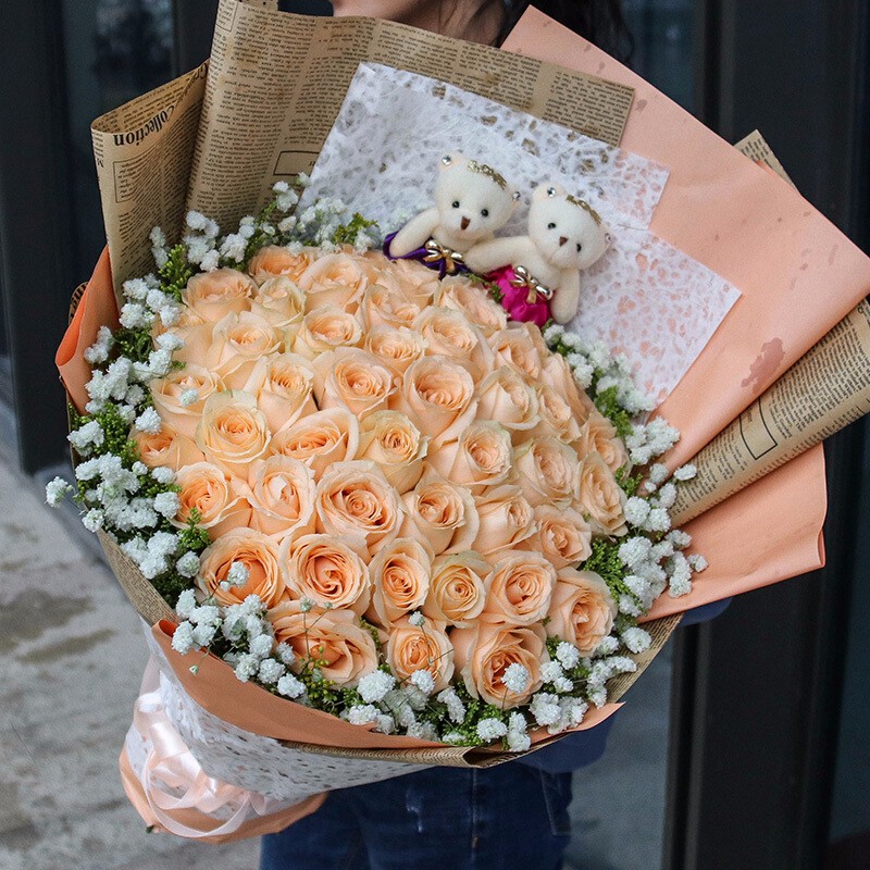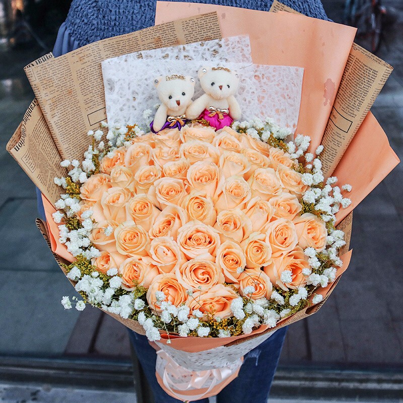 花 材:52支香槟玫瑰,2只可爱公仔,黄莺、满天星装饰。