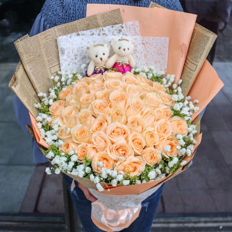 花材: 52支香槟玫瑰,2只可爱公仔,黄莺、满天星装饰。