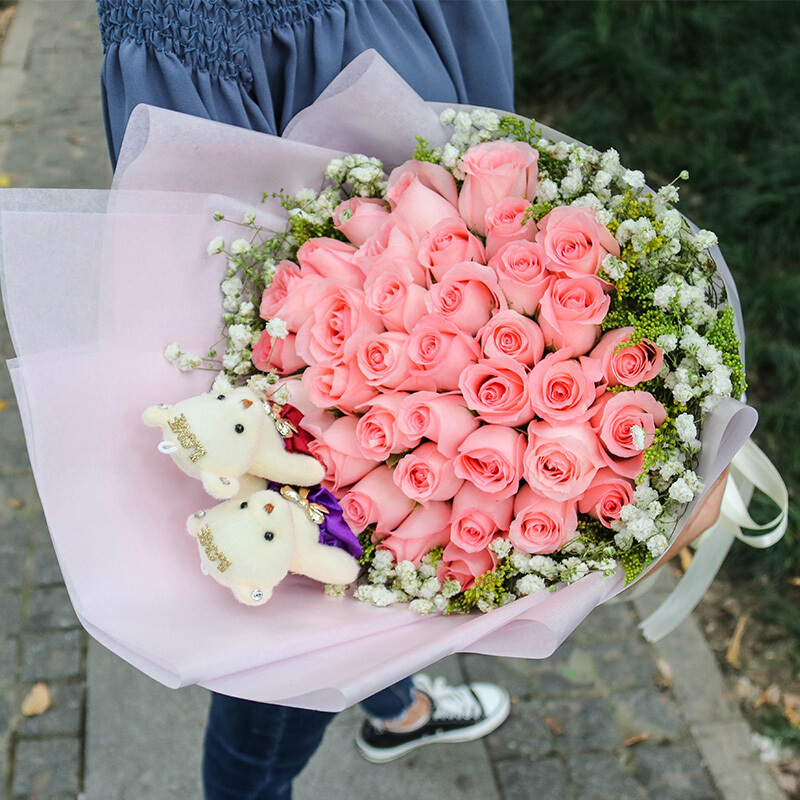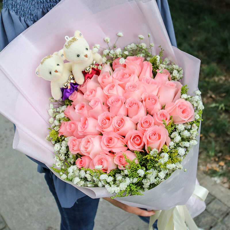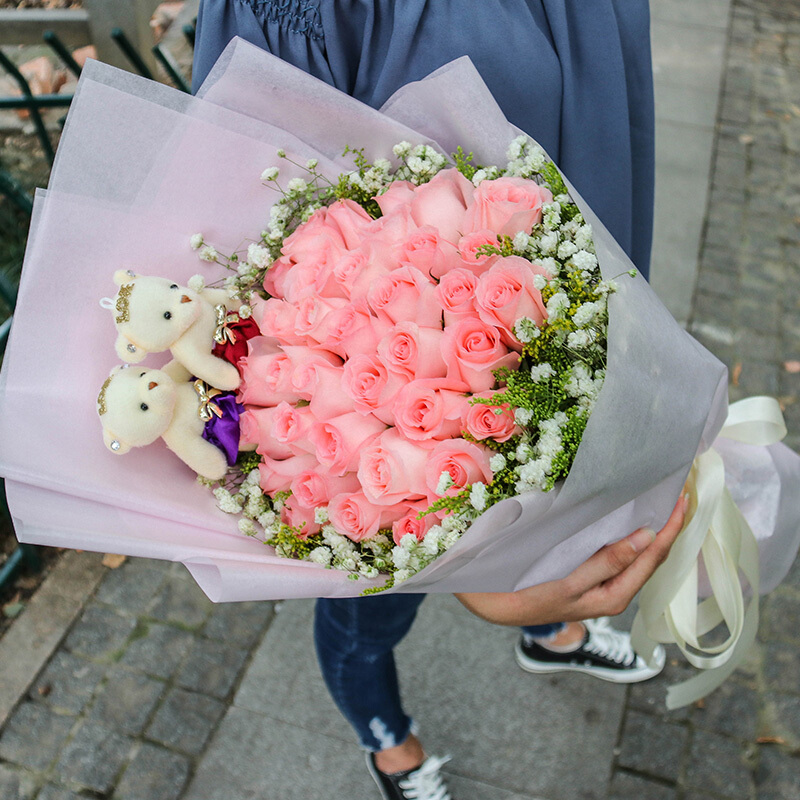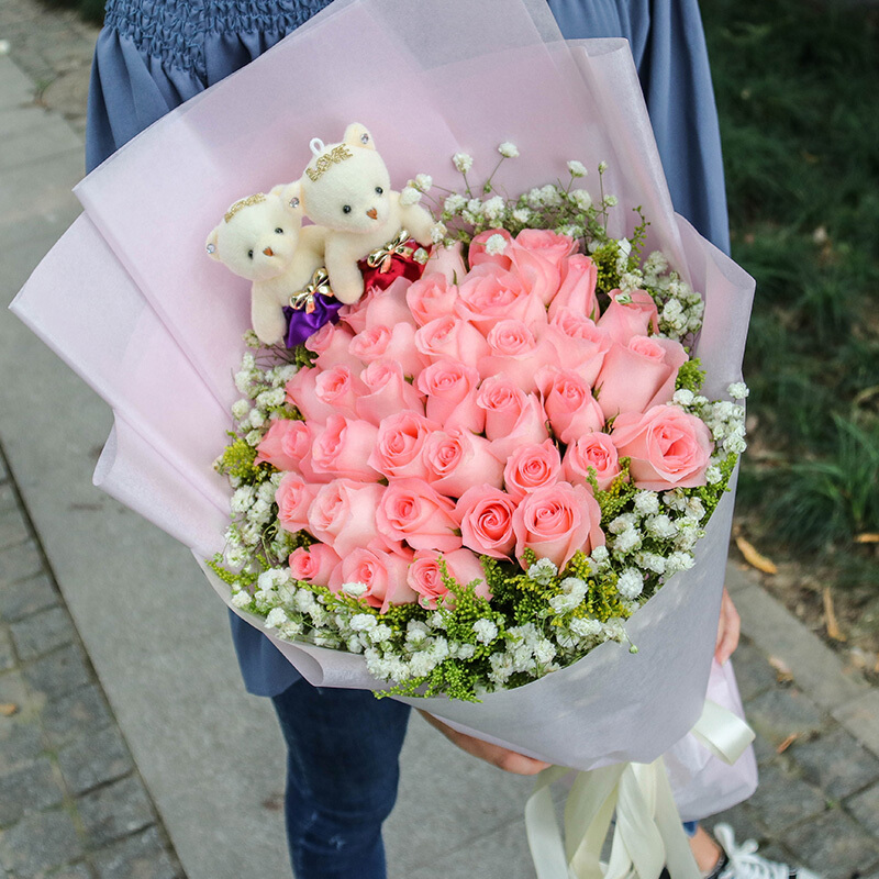 花 材:33朵精品粉玫瑰,2只可爱公仔,黄莺、满天星外围丰满环绕。