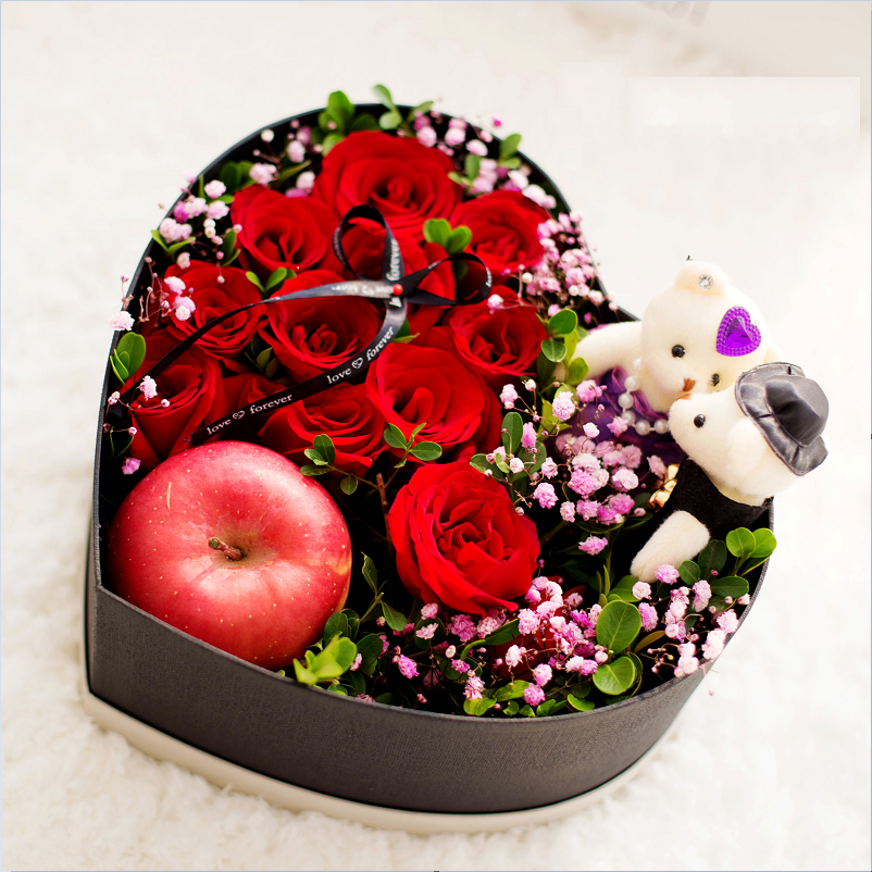 花 材:11只精品红玫瑰,可爱小熊2只,平安果1个,花面蝴蝶结装饰,搭配石竹梅、满天星、绿叶。