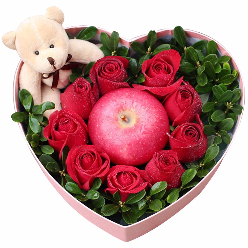 花 材:9朵红玫瑰、1颗红苹果、1只可爱小熊,搭配适量绿叶。