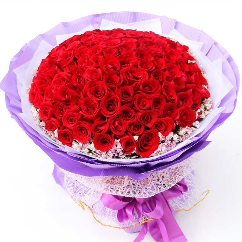 包 装:白色硬面纸内衬,紫色皱纹纸多层外包,纱网托底,紫色法式蝴蝶结束扎。