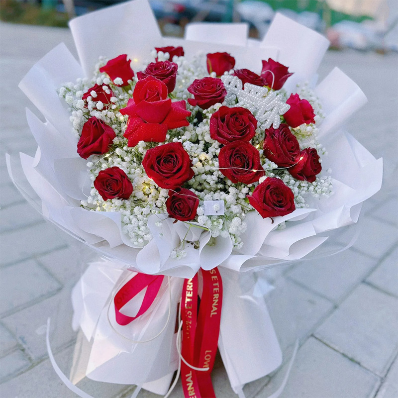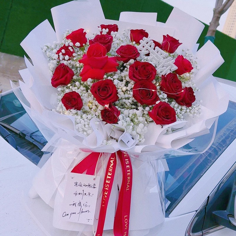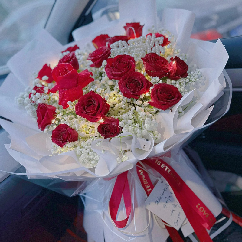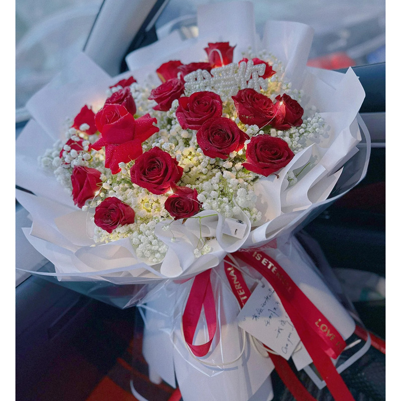 花材: 19朵红玫瑰,1条灯串,搭配满天星丰满装饰。