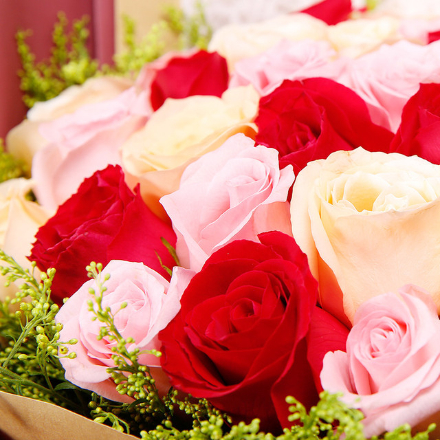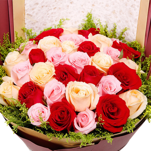 花 材:33枝混搭玫瑰(红、粉、香槟),黄莺点缀。