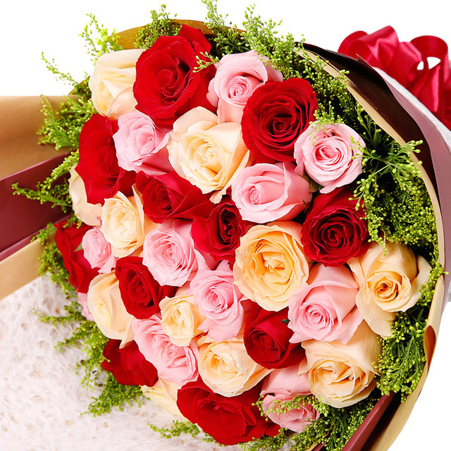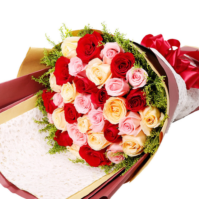 花材: 33枝混搭玫瑰(红、粉、香槟),黄莺点缀。