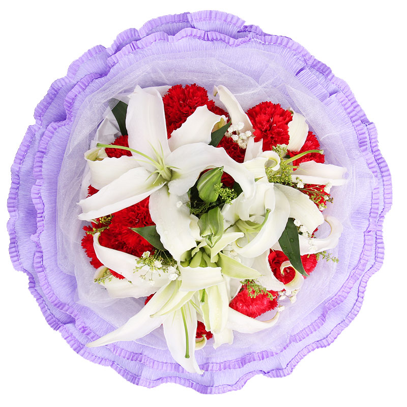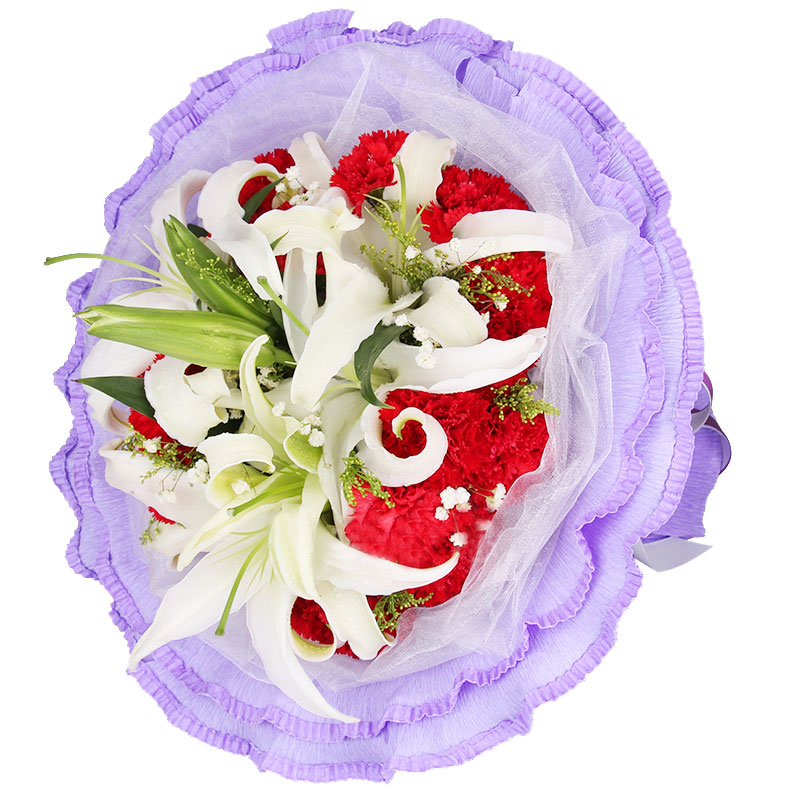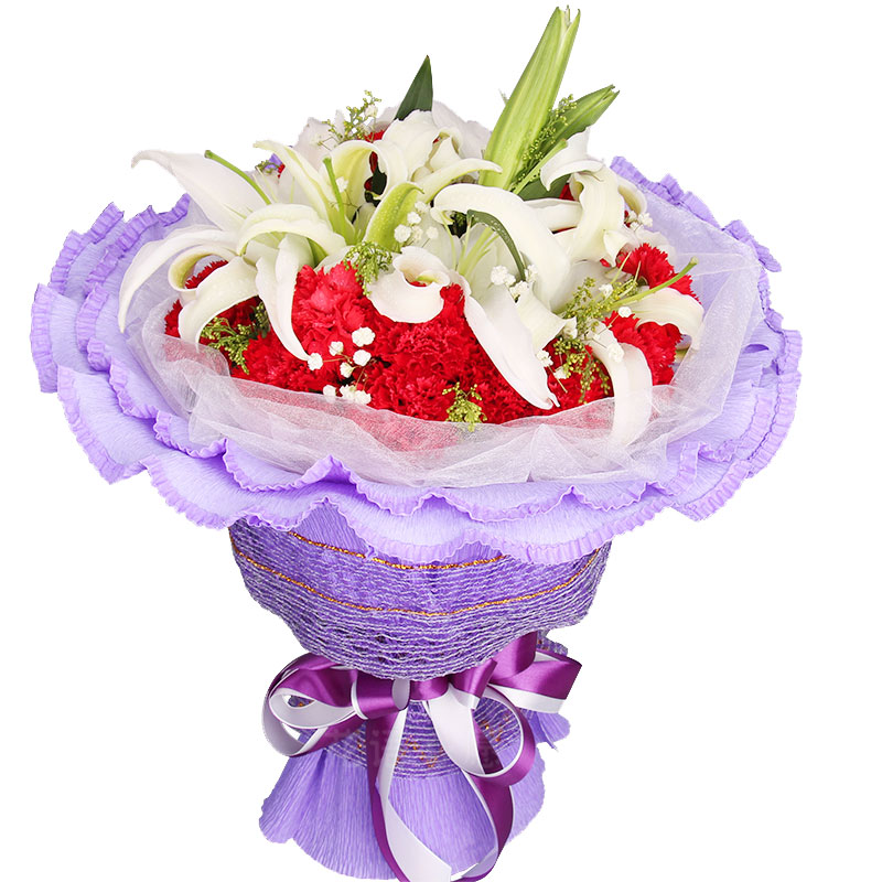 花材: 19朵红色康乃馨,2枝香水白百合,搭配满天星、黄莺点缀。