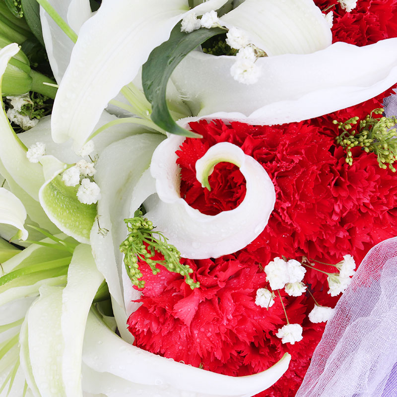 花 材:19朵红色康乃馨,2枝香水白百合,搭配满天星、黄莺点缀。